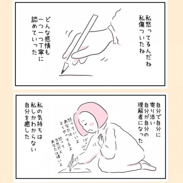 嫌い、愛せないという感情を抱くこともありますが、結局いつも頭の中は息子でいっぱいだとあゆみさんは気づきました。そして自分で自分に寄りそうために、思っていることを口にしてみることに。そうしているうちにだんだん感情が荒々しくなっていきます。そして紙にも抑えていた感情を書き殴ったのでした。