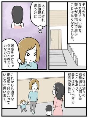 現在は、こちらからの連絡は控えていた上に別の幼稚園に入園したこともあり、会えばあいさつする程度の付き合いに……。これからも適度な距離感で付き合っていけたらと思います。