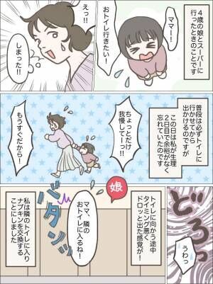 いつもは外出する前に娘にはトイレに行かせていましたが、その日は私が生理中で、娘のトイレのことまで頭がまわっておらず……。案の定、買い物中に娘が「トイレに行きたい!」と言いだしたので、スーパーのトイレを借りることにしました。