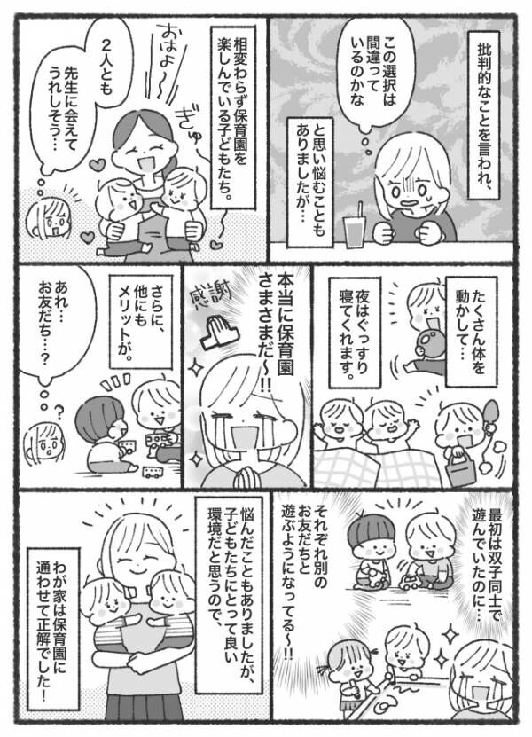 双子の子どもたちを家でひとり面倒を見ていたら、十分に体を動かすこともできなかったかもしれません。保育園に通うことにより、私は働くことができて家計も助かり、子どもたちはより良い環境で日々を過ごすことができそうです。私の家の場合は子どもたちを保育園に通わせてよかったと思っています。