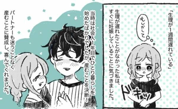生理が1週間遅れていると思いました。生理が遅れたことがなかった私は、すぐに妊娠していることに気がつきました。当時私は社会人1年目でひとり暮らしを始めたばかりでしたが、一瞬も迷うことなく産むことを決断しパートナーに報告。パートナーも迷うことなく産むことに賛成し、喜んでくれました。