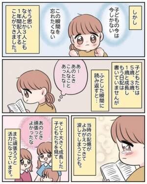 子どもたちは5歳、3歳、1歳と成長し、もう日記は書いていませんが、急に読みたいなと思うことがあります。読み返してみると、「あーあのときこんなことがあったな」「こんなこと思ったな」と当時の記憶がよみがえってきて、懐かしくなって涙してしまうこともあります。