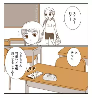 そして、すみかさんとノナちゃんが教室で2人になったときのこと。ノナちゃんはウタちゃんの机にあるメモ帳を見て、「も〜らい♡」と自分のカバンに入れてしまいました。盗った!?と衝撃をうけたすみかさん。ウタちゃんのものを盗っているのはノナちゃん?という疑惑をもつのでした。