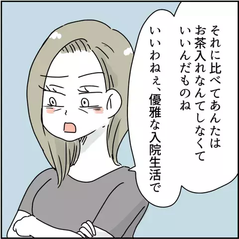 育児の面で頼るなと言ってきたヨツバさんの母親ですが、なぜか毎日ヨツバさんと娘の面会に来ます。しかし、面会に来ても「私のときは大変だった」「いいわねぇ、優雅な入院生活で」と嫌味ばかり。