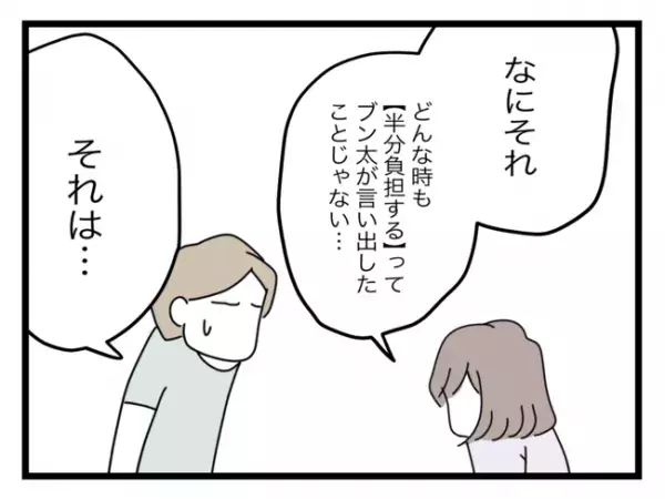 マチ子さんがどんなに苦しんでいても頑なに半分ルールを押し付けてきたブン太から、まさかの「臨機応変」という言葉が。しかし、「妊娠を言い訳にしてサボろうとするから」と悪気もなく言う姿には、ブン太は何も変わっていないことがわかります。このままではマチ子さんの心身ともに、負担が増えていくだけ。