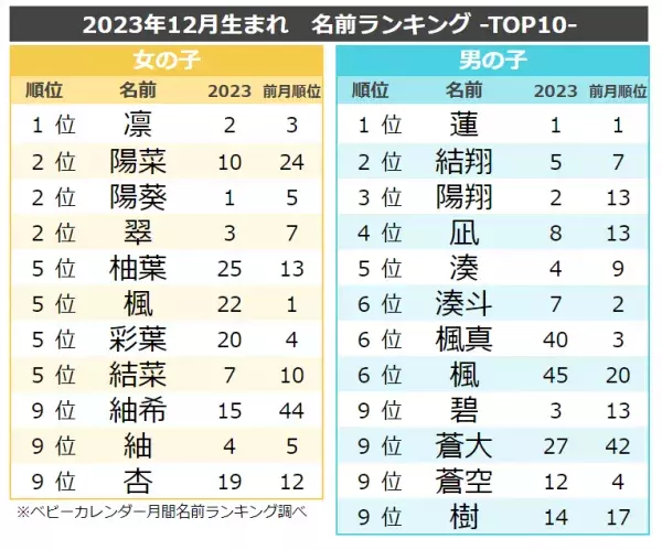 女の子の名前ランキングTOP3は、1位「凛(主なよみ:りん)」、2位「陽菜(主なよみ:ひな)」・「陽葵(主なよみ:ひまり)」・「翠(主なよみ:すい)」でした。「凛(主なよみ:りん)」は、2023年の年間ランキングで2位にランクインした人気の名前で、2023年8月以来4カ月ぶりに首位を獲得しました。