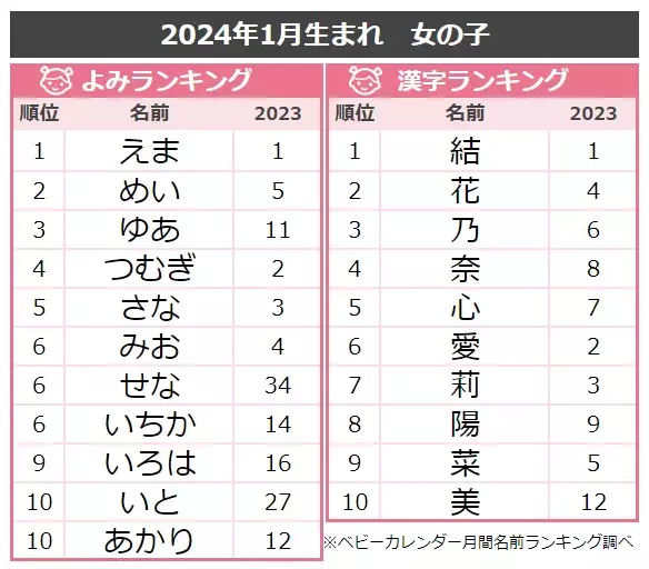 2024年1月生まれの女の子の赤ちゃん3,254名の名前から、女の子の漢字・よみの人気ランキングTOP10を紹介いたします。