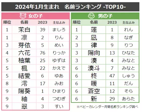 女の子の名前では、「茉白(主なよみ:ましろ)」が2023年12月の19位から、2024年1月は首位へと大きくランクアップ。「ましろ」という響きが「真っ白」を連想させ、冬の雪景色をイメージさせるようです。