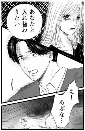 「いいよね、好きなように生きられて……。」とつい言ってしまいます。そして、「替われるものなら……あなたと入れ替わりたい」と本心を告げたところ、動揺した夫はハンドル操作を誤ってしまい……。