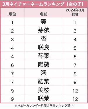 ネイチャーネームランキング上位の名前は、2024年3月の総合ランキングでも上位にランクインしていることがわかります。