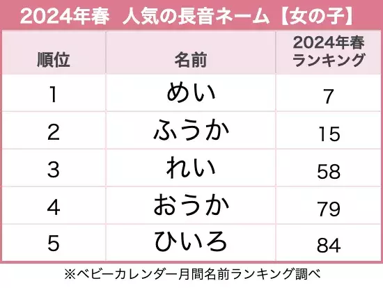 2024年春(3月・4月)に生まれた7,016名の女の子の名前から、「長音ネーム」よみランキングTOP5を紹介します。