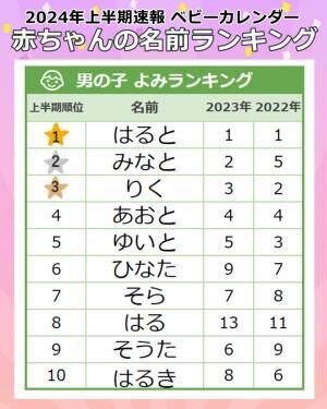 2024年上半期男の子のよみランキングTOP3は、1位「はると」、2位「みなと」、3位「りく」でした。首位の「はると」は2022年・2023年に引き続き首位を獲得した人気の名前。「はると」はよみに「はる」を用いた「はるネーム」の一つで、年間を通して人気が高いですが、毎年春になるとより増加する傾向があります。
