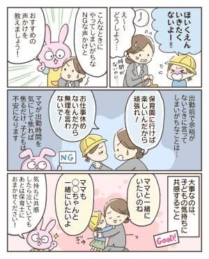 私は体験者なのでパパやママの気持ちがよくわかります! こんなときに思わず言ってしまいがちなことは、「保育園に行けば楽しいんだから頑張れ! 」、「お仕事休めないんだから無理を言わないで!」という言葉です。パパやママが焦って、出勤時間へ気持ちが向けば向くほど子どもは不安になります。