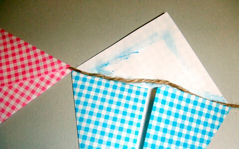 2.二等辺三角形の底辺にあたる折り返しの部分に麻ひもを通し、のりづけをして固定します。これを繰り返し、飾る場所に適した長さになれば完成!