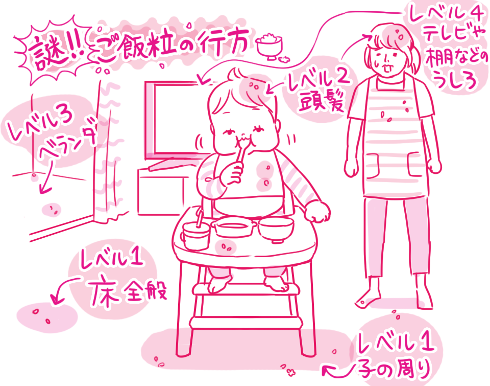 それが1歳児という生き物なので、まあそういうものだと諦めて、母は飯粒を拾うわけです。しかし、拾いきれなかった米粒が、気がつくとベランダや布団の上など、もうそれ圏外でしょ?というようなところにも落ちてるんですよね。