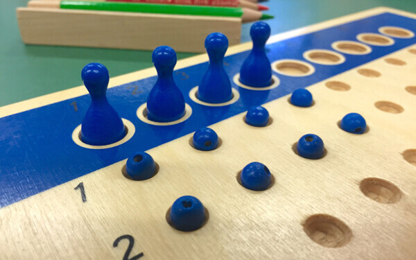 量=具体的な物、を理解することから始まり、徐々に“抽象的・論理的”な物の考え方ができるように導いていくのが算数分野で、そのための教具は細かな段階に分けられています。