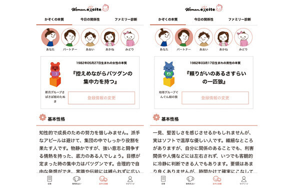 そこで、ウーマンエキサイトは毎日子どもとの相性を診断し、子どものやる気を引き出す方法やその子にあった叱り方、褒め方などを教えてくれる動物系占いと共同開発した「おやこ診断」をリリースしました。「かぞくの本質」、「今日の関係性」、「ファミリー診断」の3つのコンテンツで構成された「おやこ診断」は、ウーマンエキサイトアプリ限定のコンテンツで、iOSは2018年3月13日、Androidは2018年3月22日より配信されます。