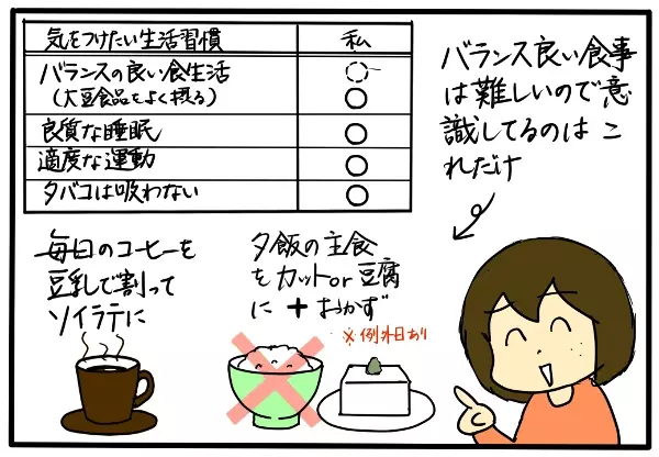 私は今回の検査で良い結果が出ましたが、ちょうどここ2年くらい太りやすくなった気がして、以下のような生活を心がけていました。なんと女性ホルモンにも良い生活を送れていたようです。