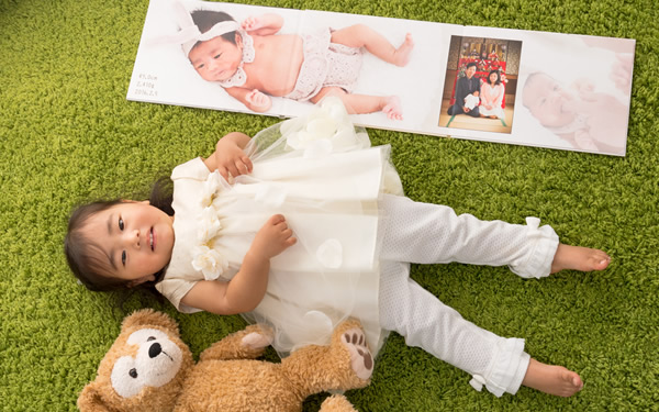 以上の点を参考に、子ども、赤ちゃん、ペットの撮影を楽しんでください。今回、お話しをお伺いしました『いりそ写真館』では、等身大アルバムという、赤ちゃんやペットを撮影時のサイズでお見せするサービスがあります。あの頃は、こんなに小さかったんだと実感できる写真の一つになりますね。