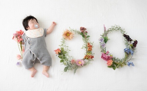 おむつや手作りのデコレーションで「100」を描いた床に赤ちゃんも一緒に寝かせ、俯瞰(ふかん)で撮影する「寝相アート写真」も人気です。アイディアを凝らしながら、自宅で手軽にチャレンジできます。