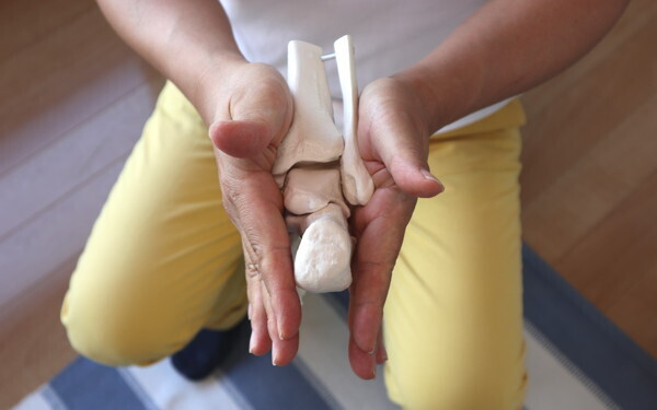 右足のかかと側から見た骨格模型。すねの骨からかかとの骨までをまっすぐな配列に保てるかが生涯にわたって歩けるかどうかのポイント