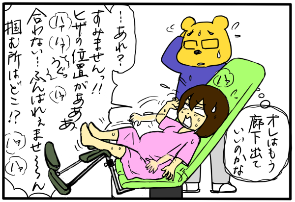 膝、足先を乗せる部分を看護師さん3人がかりで一番小さい人サイズまで縮めてくれたのですがそれでも届かず。どこか、どこかに捕まりたい!切羽詰まった私は思わず…