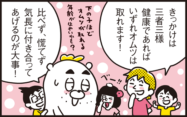 長男の時はなかなかすんなりオムツが取れず心配していましたが、3人のトイレトレーニングを目にしてきた今思うのは、オムツの外し方も三者三様。あまりできないことを責めず、少しでも前進したことを褒めてあげることが大事だと思います!