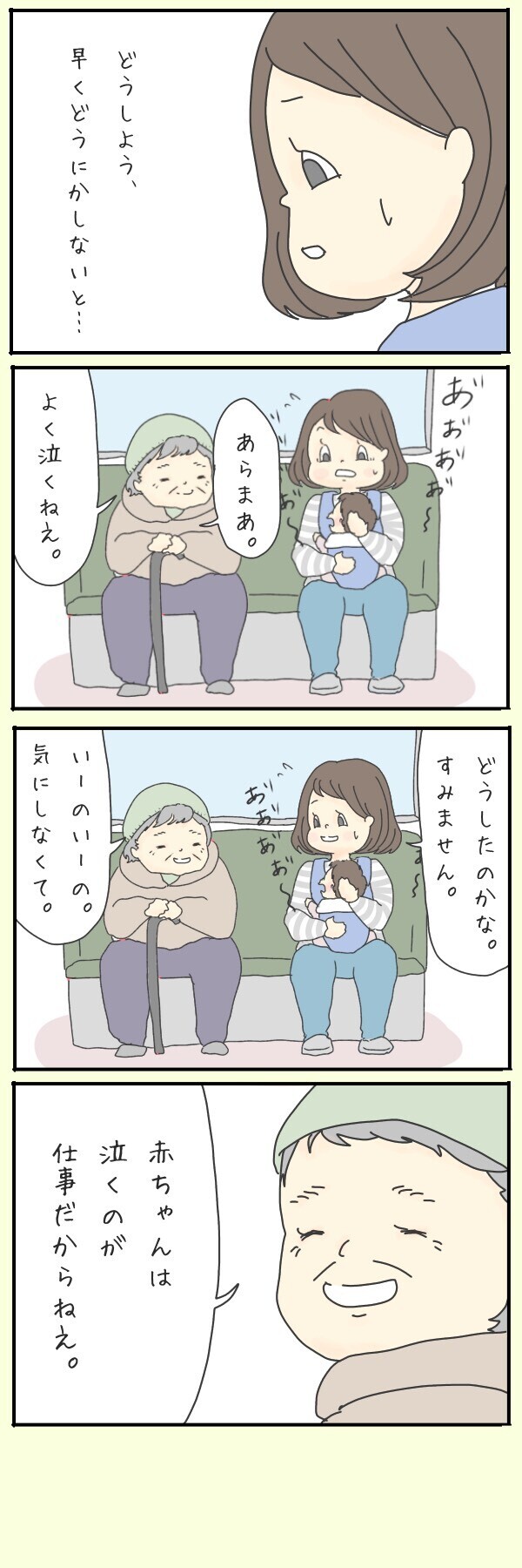 逃げ場のないバスの中、周りのお客さんの視線を気にしながら、グズってしまった長女をただよしよしすることしかできませんでした。すると隣のおばさんからこんなセリフが。