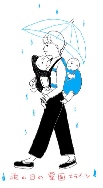 慢性的な肩こりと腰痛に悩まされながらも、双子は雨の日にもご機嫌に登園。