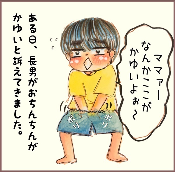 かゆいーといっておちんちんをかく回数が増えてきた長男。暑いし蒸れるとかゆくなるよねーと思いつつ見てみると、お股の周りになぞのできものが…!