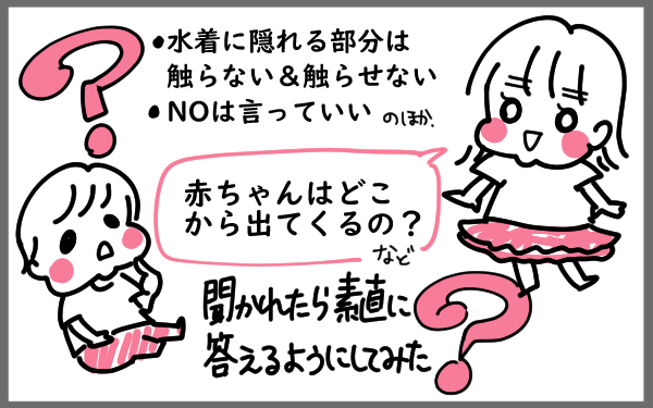 「水着で隠れる部分は触らない&触らせない」「NOは言っていい」や、子どもから「赤ちゃんはどこから出てくるの?」といった質問があったら、素直に答えるようにしてみました。