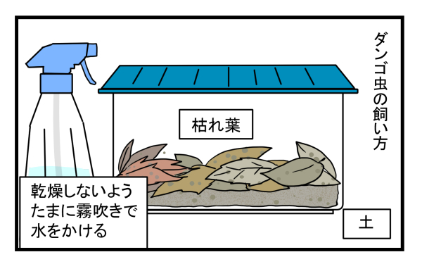 ダンゴ虫がいた場所の土や枯れ葉と一緒にケージにいれるだけで飼育環境は完成。