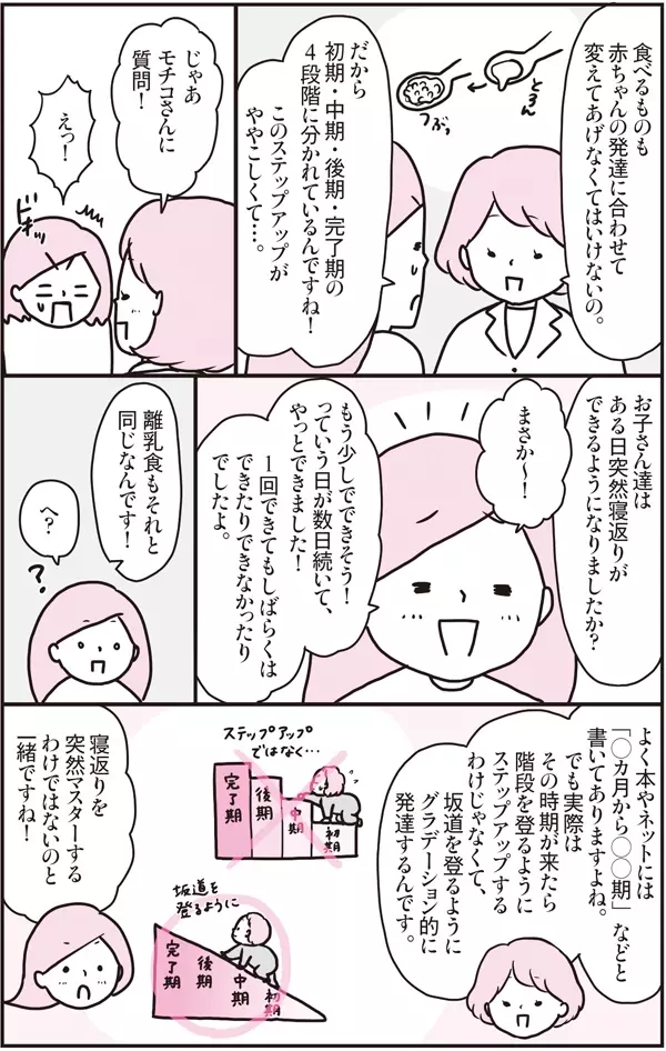 といっても、「〇ヶ月になったから〇〇しなくちゃ!」と厳密に考える必要はなく、子どもの発達の様子を見ながら進めていけばよいそうです。