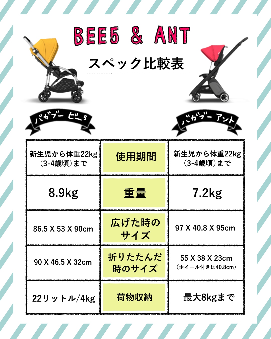 「バガブー ビー5」は折り畳みやすさ、選べるカラーの豊富さがあり育児が初めてのママに、「バガブー アント」は車に積みやすいなどコンパクトさを重視する方、また旅行用などに(何とアントは荷物が最大8kgまでOKなのです…!)セカンドベビーカーを探している人におススメです!