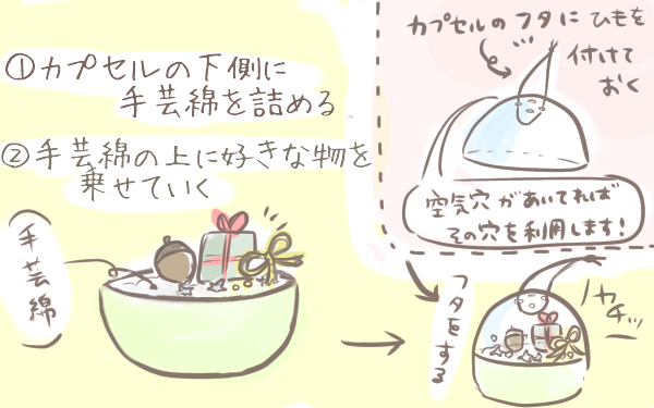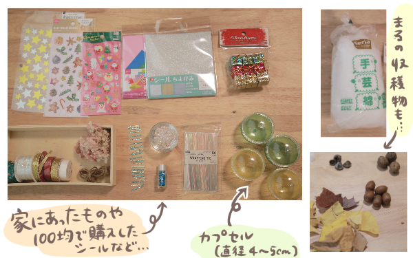 あとは外側に貼り付けるマスキングテープやシール、中に入れるビーズや小さなマスコット、拾ったどんぐりや落ち葉やドライフラワー、子供の写真など、カプセルに入るサイズのものなら何でもOKです!