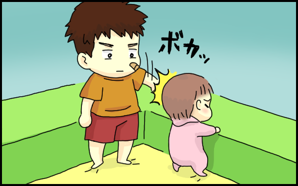 その後も、赤ちゃんのおもちゃを奪い取り、どついたり、たたいたり…そのお兄ちゃんは好き放題、赤ちゃんスペースを牛耳っていきました。