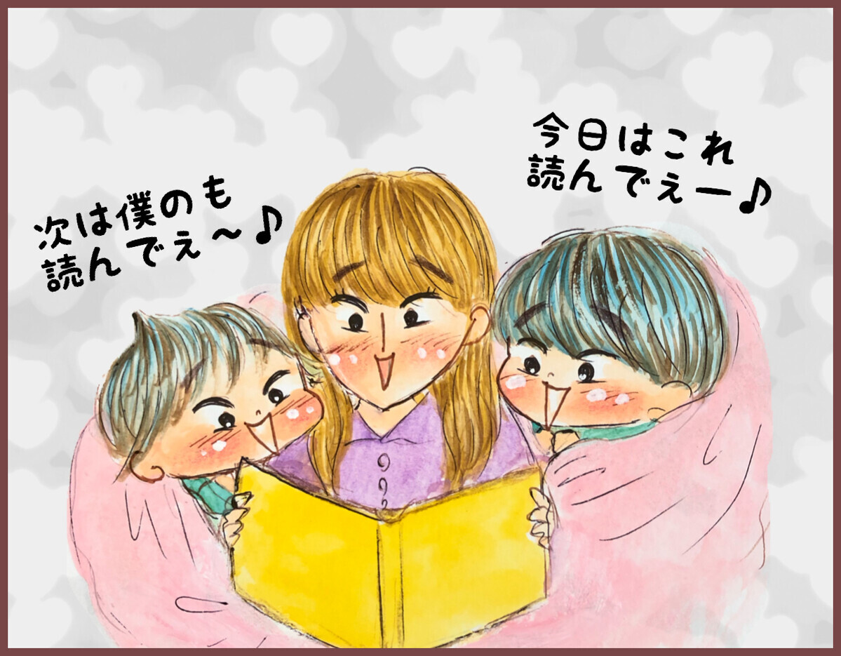 長男と次男がそれぞれ読んで欲しい絵本を一冊ずつ選んで、それをみんなで布団に包まってから読み聞かせをします。