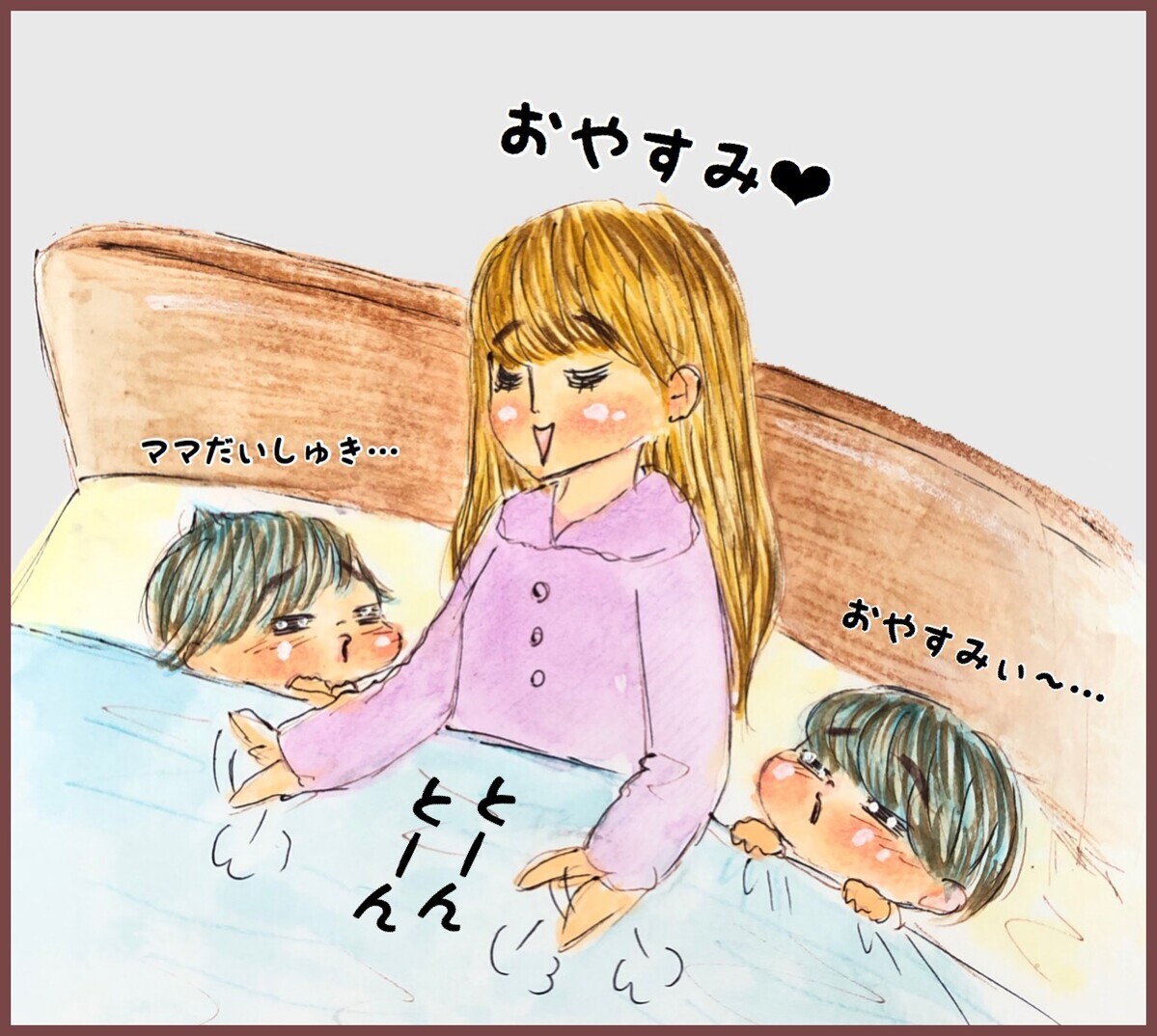 絵本を読み終わった後は布団に寝転んだ長男と次男をとんとん…。さらに長男は頭をなでなで、次男は手をにぎにぎしてもらうのが好きなようで、それを交互にやっているといつの間にか眠っています。