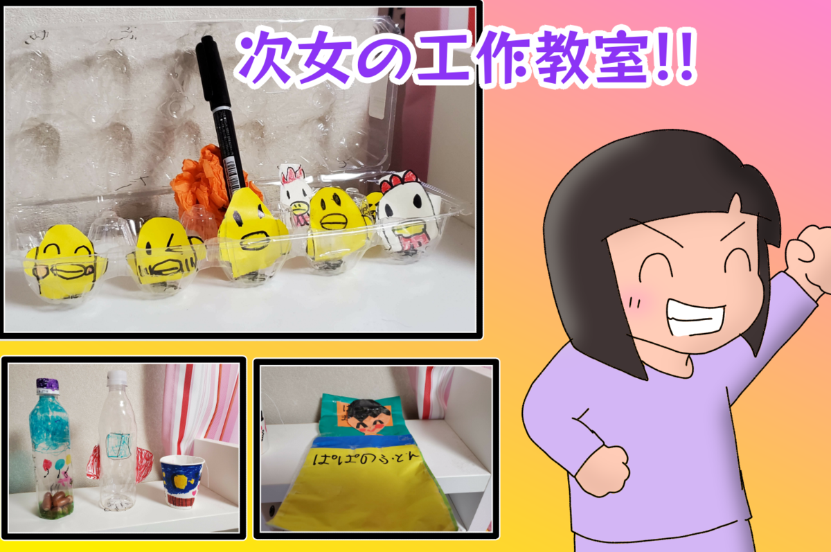 でも何をどのように使うのかは次女しだい。ペットボトルやタマゴのパック、段ボールや折り紙で色々な物を作っていましたね。