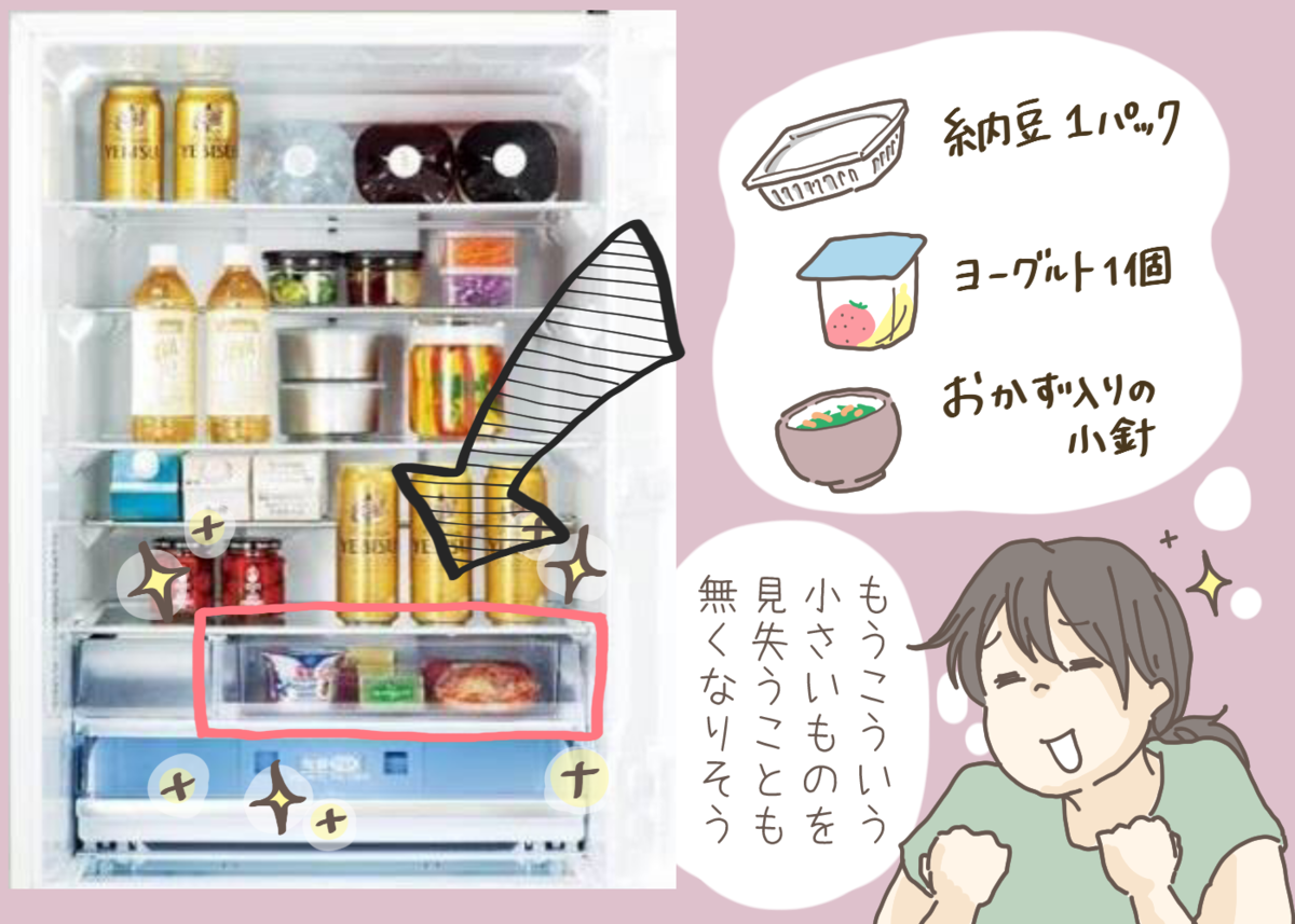 納豆残り1パック、ヨーグルト残り1パックなどなど、大物の影に隠れて迷子になりがちな物をわかりやすくかくまってくれるこのスペース、侮れないですよね。