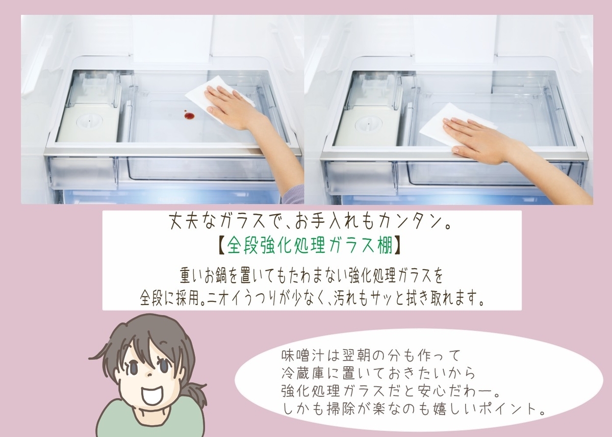 <--[IMAGE-008]--> 以前ウーマンエキサイトさんの連載で書かせて頂いた「変身前野菜」のストックはもちろん、週1回届けてもらえる大量の冷凍肉や魚、味付け調理をして後は焼くだけにしておいた食材など、我が家の冷凍室メンバーはかなり層が厚いです。量もかなり多いです。 それに加え、我が家の(特に私の)アイス需要も守るべく、冷凍室はすでに大変な事に… それでも作り置きの冷凍保存はやめられないんです。 だって「作り置き冷凍の量」と「主婦(夫)の心の余裕」って比例すると思うんですよ…(あとキャラクターレトルトカレーもね) 。 だからこそ、大容量&霜がつきにくくおいしさが長持ちする冷凍室はかなり魅力的! <--[IMAGE-002]-->3. まだまだある!ママにうれしい時短ポイント!