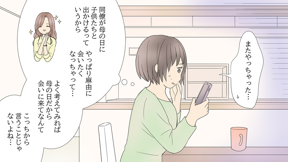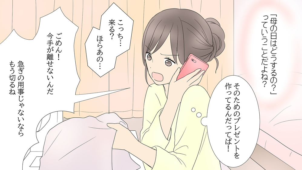 母の日にプレゼントするために洋服作りに励む娘・麻由。そこに母から電話がかかってきて…