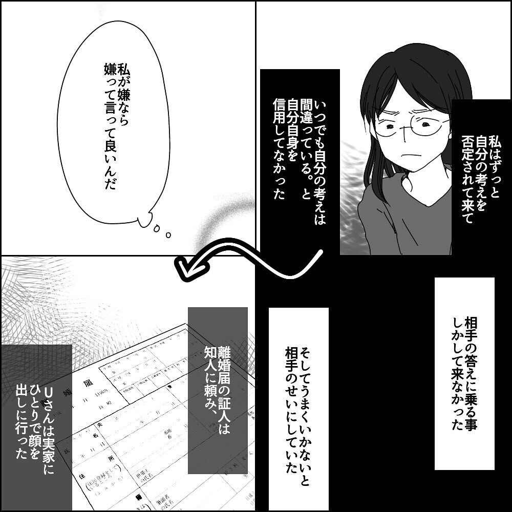 Uさんにはずっと自分の考えを否定されてきたので、いつも自分の考えは間違っていると思っていました。しかし、兄の言葉を聞いて「嫌だと思ったら嫌だと言っていいんだ」という、当たり前で、とても大事なことに気づきました。