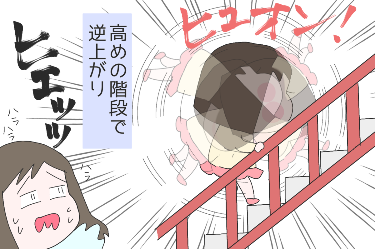 滑り台の階段の上の方で、ぐるんと一回転するひな。