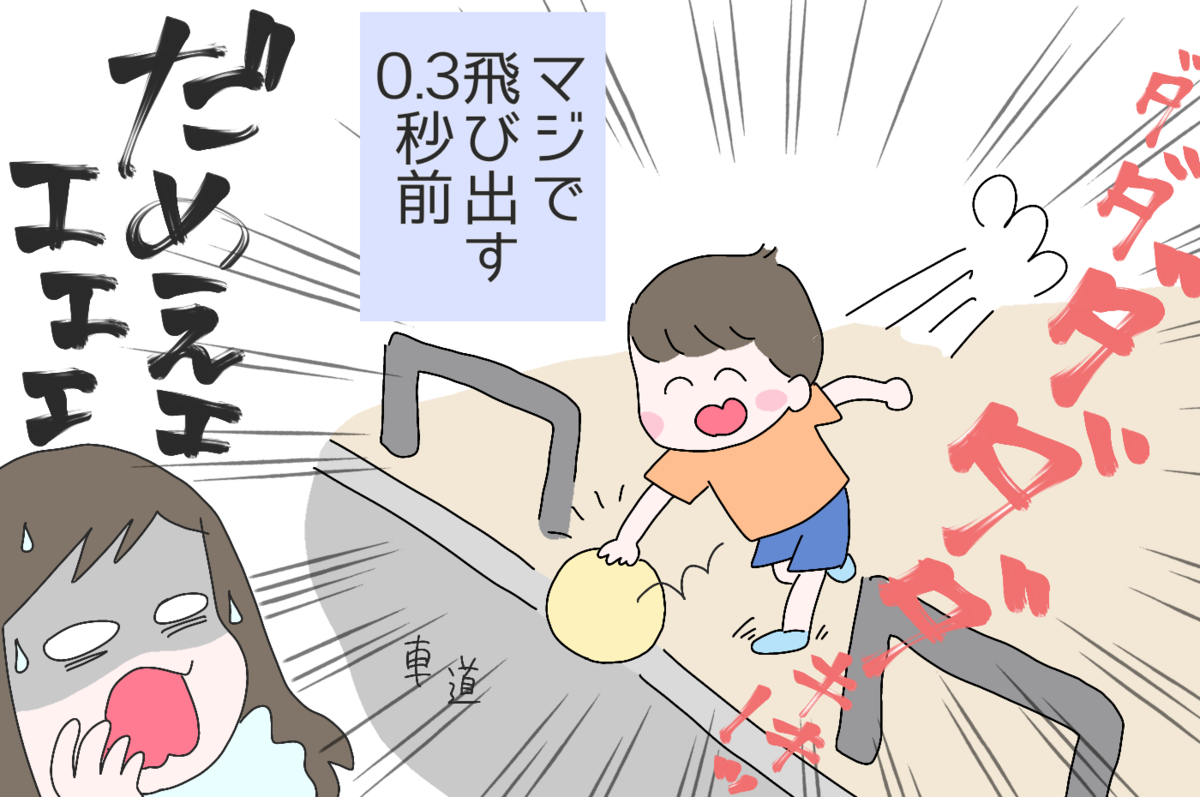 ボールを追いかけダッシュする男の子。「もうすぐそこ車道…!!」という超ギリギリで男の子はキキーッと急停止してボールをキャッチ。