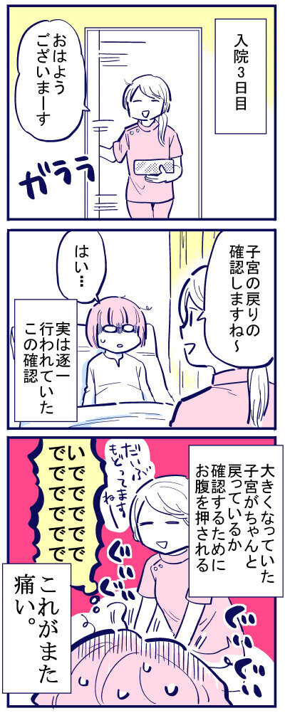 しかも、1日に何回もこの確認兼マッサージがあり、かなり苦痛でしたが、日に日に痛みは減っていきました。