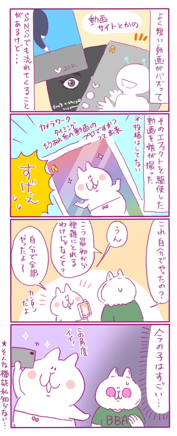 マンガにもあるようにそのアプリで投稿はせず、動画を撮っては消して、とまねごとをしているのですが、娘の動画のクオリティがすごい…。