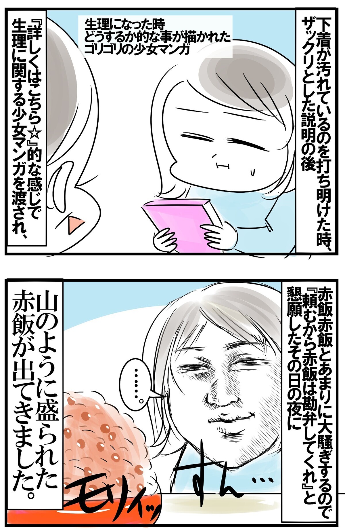 しかしその日の夜に、見事に盛られた赤飯が出され、妹や弟が不思議がる中、私に生理が来た話をみんなの前でされて…