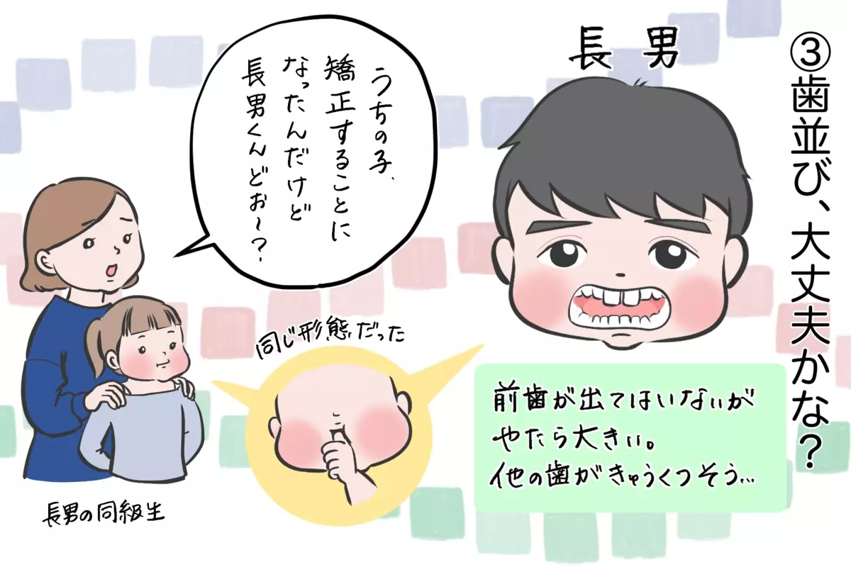 長男の口の中を見ると、出っ歯にはなっていないものの前歯がかなり大きく、後から生えてきた歯が窮屈そう…