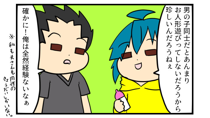 どんちゃんはもちろん、お人形をとても気に入って、かいがいしくお世話を焼いていますが、実は意外とその遊びに興味津々なのが兄のぽこちゃんだったのです。